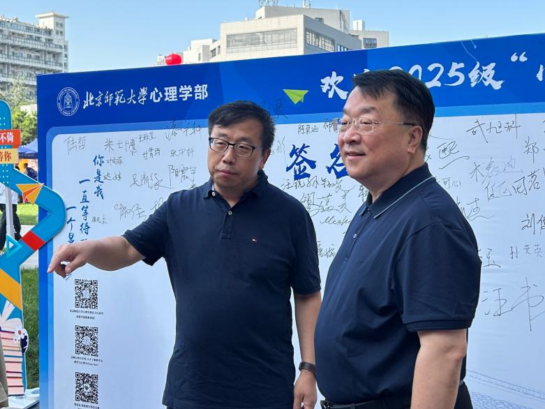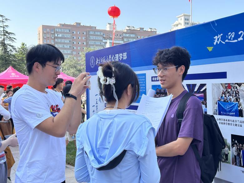 图1 学部领导了解迎新站工作情况 本学年,金牌影院 共迎来新生862人,包括本科生93人(其中综合、励耘方向32人,公费师范生34人,“心理+AI”方向27人),学术硕士研究生138人(其中北京校区75人、珠海校区63人),学术博士研究生123人(其中北京校区95人、珠海校区28人),专业硕士研究生439人(其中北京校区258人、珠海校区181人),专业博士研究生69人。