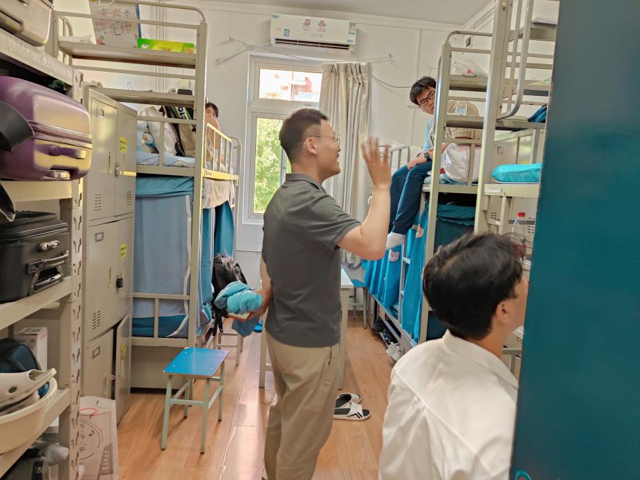 图12 新生班主任田雪涛老师走访新生宿舍 与此同时,在风光旖旎的南海之滨,学部珠海校区专业硕士、学术硕博的迎新工作也如火如荼地展开。学部工作人员和新生班主任的热情欢迎,为他们崭新的求学之旅写下了温暖的第一笔。