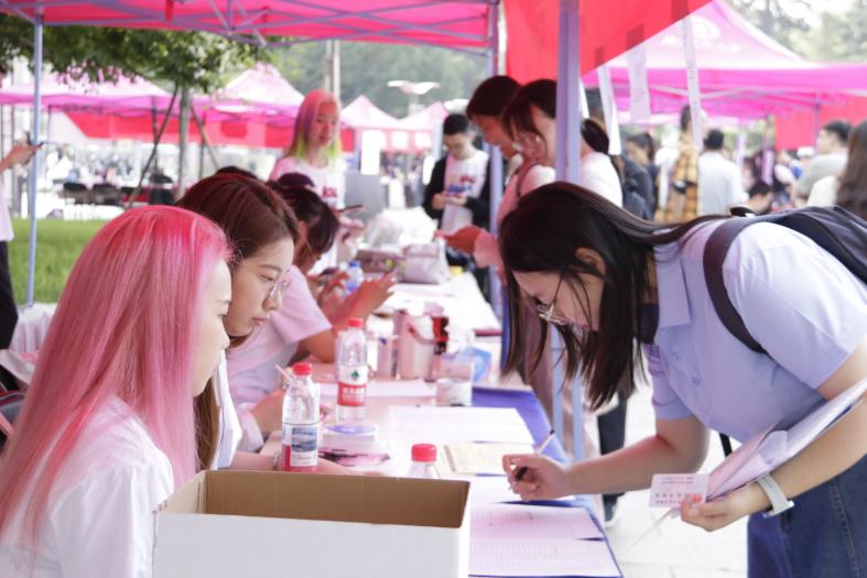 图5 工作人员为新生办理手续(后主楼) 新生在迎新站依次完成录取通知书核验与盖章、电子学籍注册、迎新物资领取后,由工作人员引导至签名墙前署名留念,并拍摄入学后的第一张纪念照片。现场还设置了简短访谈环节,为每一位新生记录下初入校园的青春印记。随后,老生志愿者陪同新生至后主楼迎新教室,协助办理户口迁移与档案接收等手续,专业硕士、专业博士新生于金丰和三层路演厅集中完成报到流程。 开学首日,金牌影院 以“心”迎“新”——从手续办理到人文关怀,从院校支持到师兄师姐的贴心帮助,新生们在各个环节都感受到了来自四面八方的热烈欢迎与真挚关爱。