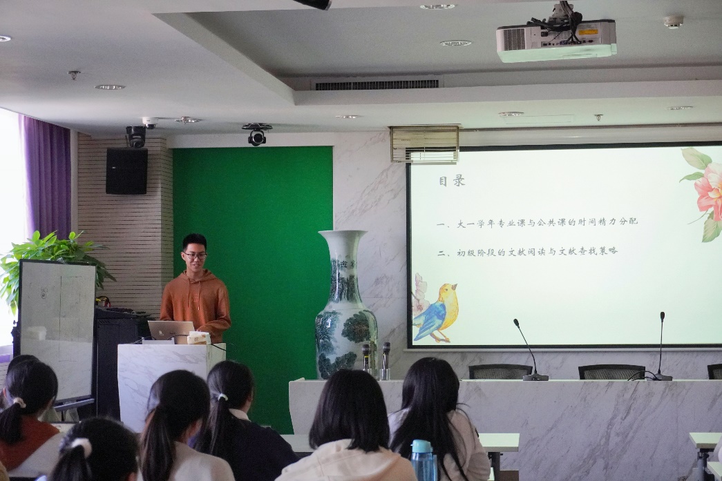 田汉墉同学进行分享 第一位进行分享的是来自21级励耘班的田汉墉同学。他从自己大一时的心态出发,回溯自己作为新生时最为关心的问题,分享了对于大一专业课和必修课精力分配的经验以及查阅文献的方法策略。针对大一上学期同学们会面对的不同专业课,他提出了相应的学法建议,并指出相信大家可以在这半年中逐步找到自己适应的学习方式。随后,田汉墉同学详细地为大家介绍了文献的种类,初步入门如何读文献以及文献的搜索方式,提供了满满的干货。
