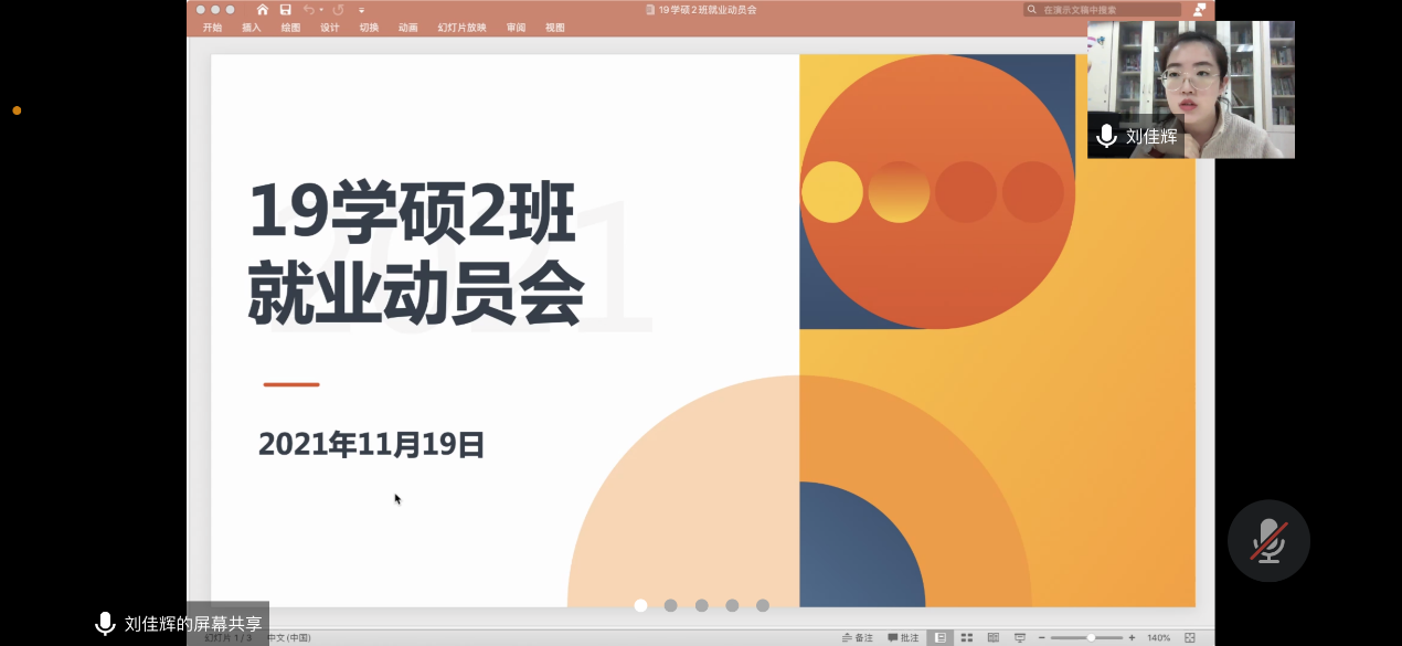 为促进毕业班级就业工作,提升学生的就业意识和求职主动性,2021年11月19日下午,金牌影院 2019级学硕2班开展了线上班级就业动员会。 会议第一部分,班主任刘佳辉老师向班级同学分析了往届学硕的就业情况,包括往届学生具体的升学和就业毕业去向,并对就业信息渠道进行了说明。