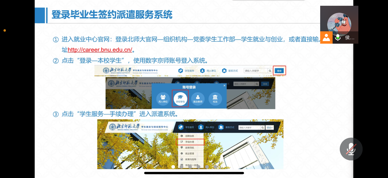 图2 侯俊彦同学介绍就业派遣系统等信息 最后,刘佳辉老师对派遣工作做补充,与同学们一同探讨大家在就业方面的问题,并表达了对同学们升学就业的全力支持,鼓励同学们毕业就业两手抓两手硬,找到适合自己的道路。祝愿所有毕业生能够找到理想、满意的工作,能够为社会贡献出心理学的力量!