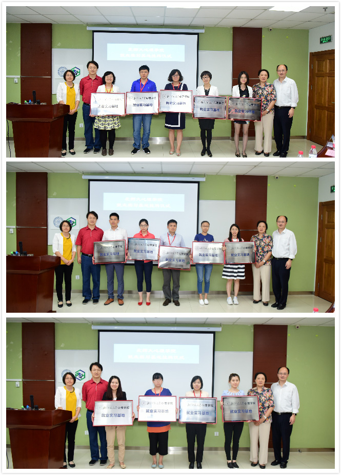 2016年6月14日下午,北师大心理学院就业实习基地挂牌仪式暨就业实习双选会在后主楼1420和1318顺利举行。北师大学生就业与创业指导中心主任白勇、心理学院院长刘嘉、脑与认知科学研究院党总支副书记林春梅和心理学院分党委副书记王瑞敏等领导老师以及来自14家企业的30多位校外嘉宾出席了挂牌仪式。会议由心理学院分党委副书记王瑞敏主持。