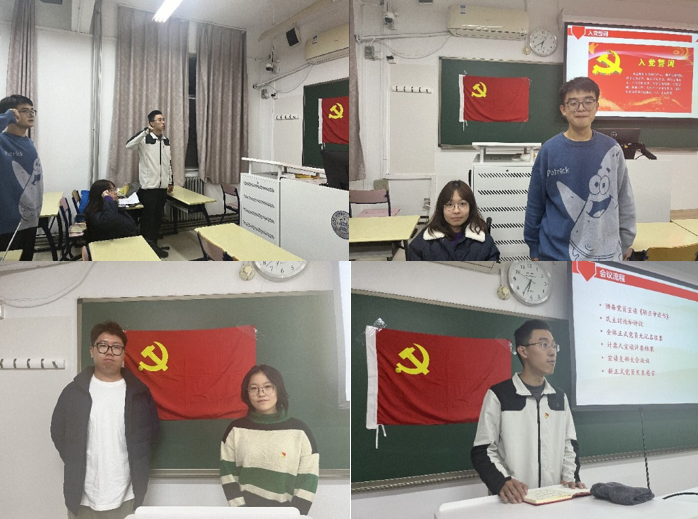 最后,两位被支部大会通过接收的预备党员同志面向党旗宣誓并合影,三位转正的党员同志在党旗下合影。党支部书记程先楷同志对本学期持续两个月的发展转正工作做了总结,对新发展同志和转正同志材料中的真挚表达和成长进步感到感动,同时要求新发展党员铭记“组织上入党一生一次,思想上入党一生一世”,后续要更严格地要求自己,并鼓励大家一起努力营造严肃活泼的支部氛围。