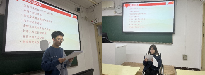 首先,孙梓耀同志宣读了自己的入党志愿书。孙梓耀同志就他递交入党申请书以来的思想政治觉悟情况以及学习工作情况向党组织汇报,并表示将继续积极向组织靠拢,时刻以党员标准来规范和要求自己。之后由介绍人李佼佼、刘一诺宣读介绍人意见,由支部书记程先楷同志宣读政治审查综合报告并提请支部大会讨论。经过民主讨论和评议,支部大会全体正式党员进行无记名投票表决,同意接收孙梓耀同志为中共预备党员。孙梓耀同志发表了入党感言,承诺在未来将提高要求,充分发现自己的不足,努力提升自己,为国家的教育事业贡献自己的力量。 接下来,沙瑞欣同志宣读了自己的入党志愿书,向党组织汇报自递交入党申请书以来的自己思想作风以及工作学习情况,并表示将继续积极向党组织靠拢,积极参加党组织开展的各项活动,自觉以党员标准严格要求自己。之后由介绍人程先楷、李佼佼宣读介绍人意见,由支部书记程先楷同志宣读政治审查综合报告并提请支部大会讨论。经过民主讨论和评议,支部大会全体正式党员进行无记名投票表决,同意接收沙瑞欣同志为中共预备党员。沙瑞欣同志发表了入党感言,感谢党组织及各位同志对自己的信任,并承诺在未来将更加严格要求自己,努力为师生办实事。