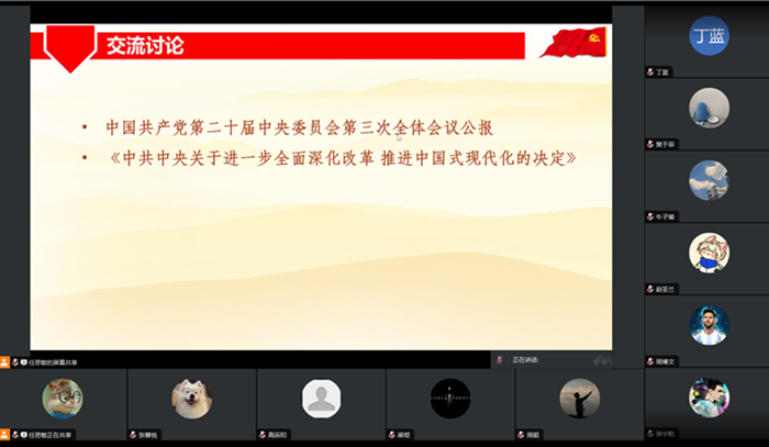 2024年8月8日19时,金牌影院 本科生第一党支部8月份主题党日活动通过腾讯会议平台以线上形式顺利开展。活动由党支书任思敏同志主持,共34名同志参与。本次活动的主题为学习“党的二十届三中全会精神”。