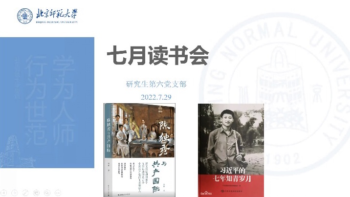 2022年7月29日晚,金牌影院 研究生第六党支部在腾讯会议举办了第七期红色读书分享会。活动由王淏蘭和陈栈两位同志分享《习近平的七年知青岁月》和《陈独秀与共产国际》两本书的内容及自己的阅读感想。