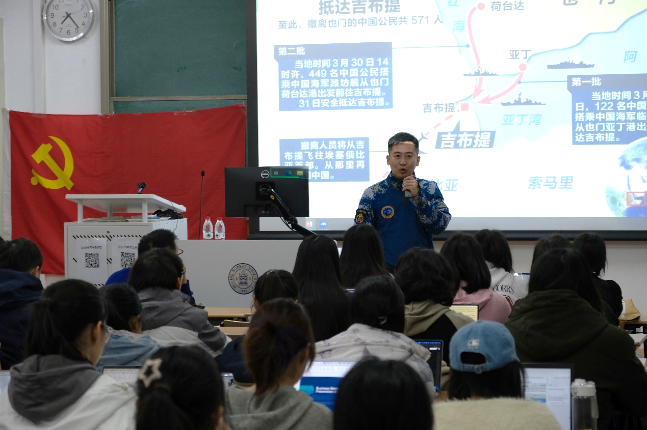 接下来,时任也门撤侨外事联络官的谢晓飞中校分享了在撤侨中的亲身经历,让同学们直观感受到了人民子弟兵的优良作风和伟大祖国的大国担当。谢晓飞中校讲述了当时真实发生的故事:房间不够,同胞睡房间,战士睡走廊;炊事班人手不足,同胞吃正餐,战士吃馒头。中国海军饱含人道主义精神的“逆行”,不仅是对同胞的救援,更是对世界和平的重要贡献。
