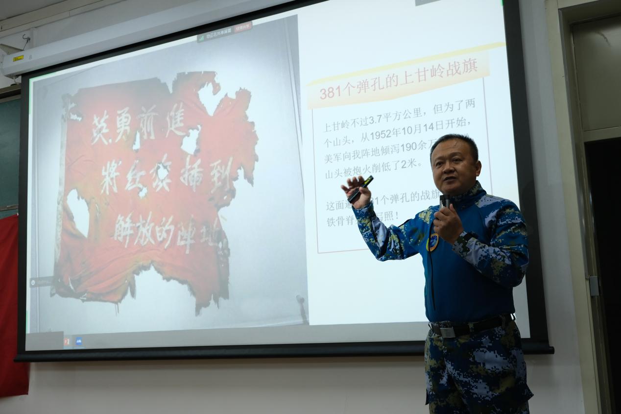 林政委随后分享了新时代英雄军人的事迹——为保战机英勇牺牲的飞行员张超,舍小家为大家的时任石家庄舰副舰长李治国以及在中印边境冲突中英勇负伤的英雄祁发宝,壮烈牺牲的烈士陈红军、陈祥榕、肖思远和王焯冉。到场师生被深深感动。最后,林政委激励同学们未来用自己的专业努力为祖国做贡献。大家深表认同,收获满满。