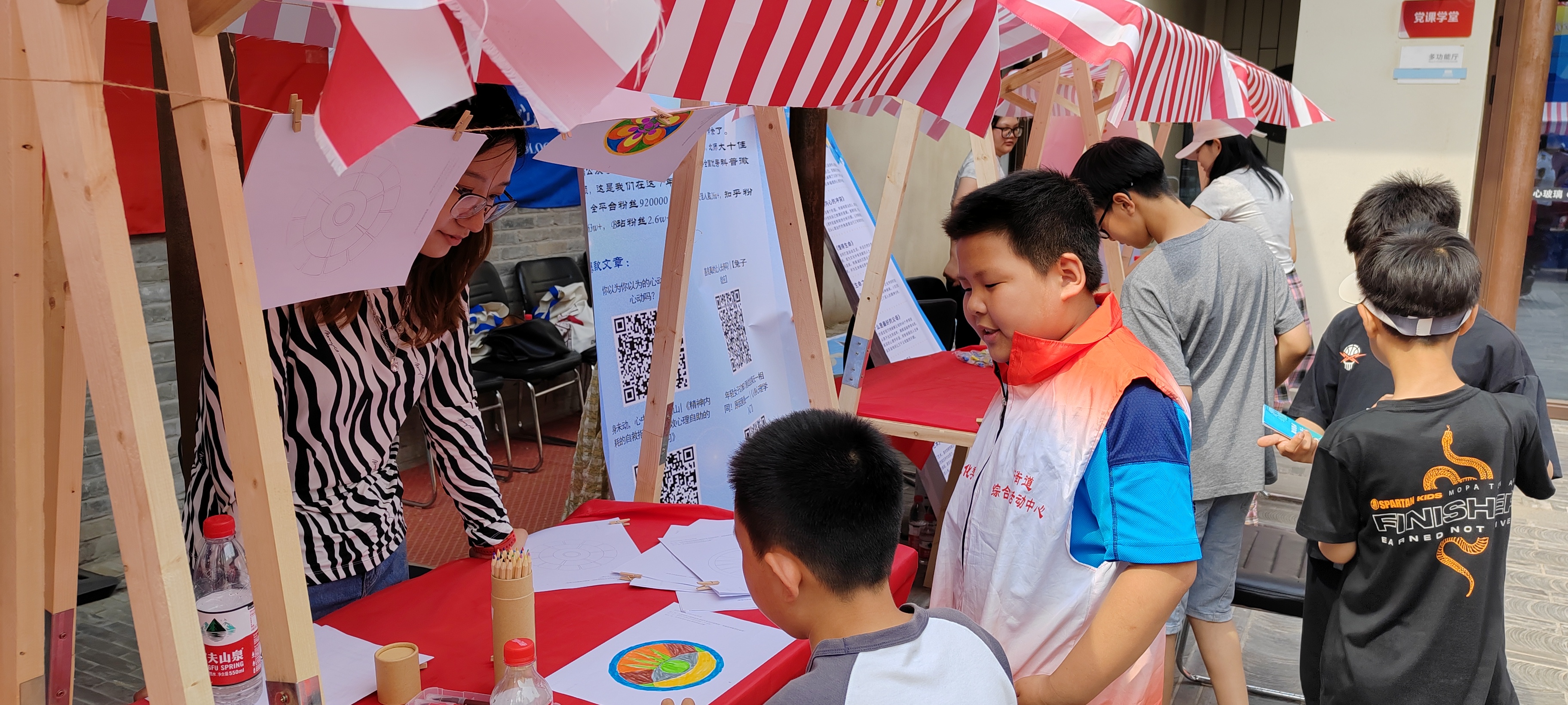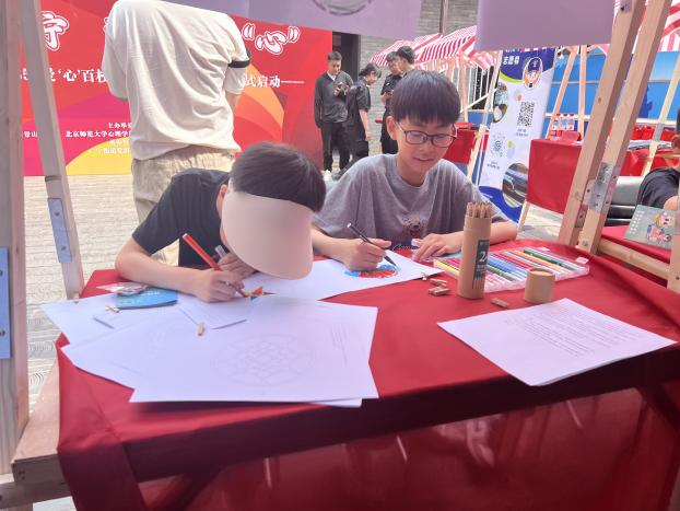 在室外空地,由金牌影院 党团支部志愿者们开设的曼陀罗绘画、心理科普文章、心理科普书籍推荐和心理知识问答飞行棋四个外场活动也深受小同学们的喜爱。他们通过多彩的曼陀罗绘画探索和表达自己的内心世界,阅读有趣又有知识的心理科普推送与书籍,游玩飞行棋来了解心理学的科学知识,增进了对心理学、心理健康的认识。