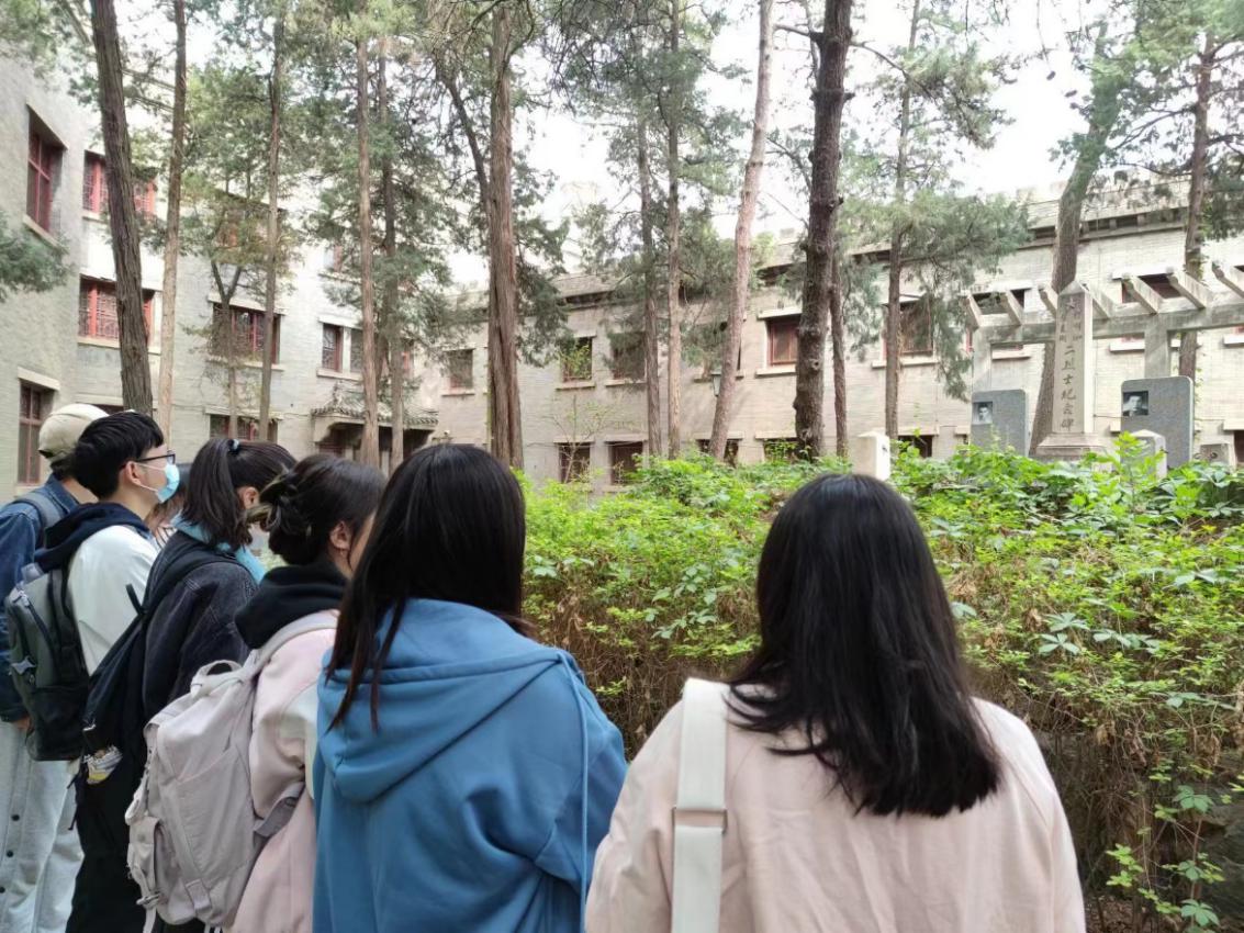 在二月兰盛放的中庭花园里,同志们在陈明如、张崑刚二烈士纪念碑之下,听取于心怡同志为大家讲解辅仁大学的建立、更名、校舍故事和师生的抗日事迹。同志们仔细阅读并讨论交流纪念碑上篆刻的烈士故事,深受感动。