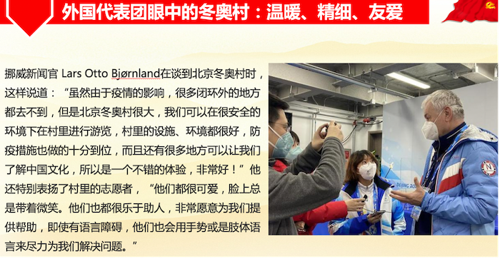 何文宣同学从国际的视角介绍了“世界如何看冬奥”,从充满创意和极具美感的开幕式,到各国运动员在冬奥村的生活分享,再到外国代表团对冬奥村的高度评价,展现了北京冬奥会在世界上的出圈之势。
