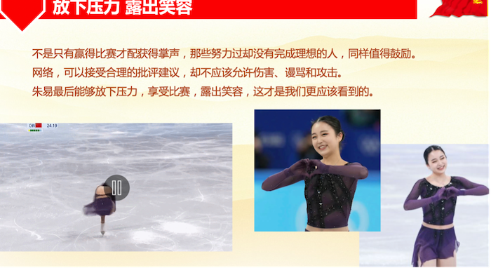 魏铱楠同学以花滑运动员朱易的故事,和大家分享“有一点恻隐之心不过分”的观点:不是只有赢得比赛才配获得掌声,那些努力过却没有完成理想的人,同样值得鼓励。网络可以接受合理的批评建议,却不应该允许伤害、谩骂和攻击。希望我们能够给予运动员更多的鼓励,拒绝任何类似网暴的现象发生。