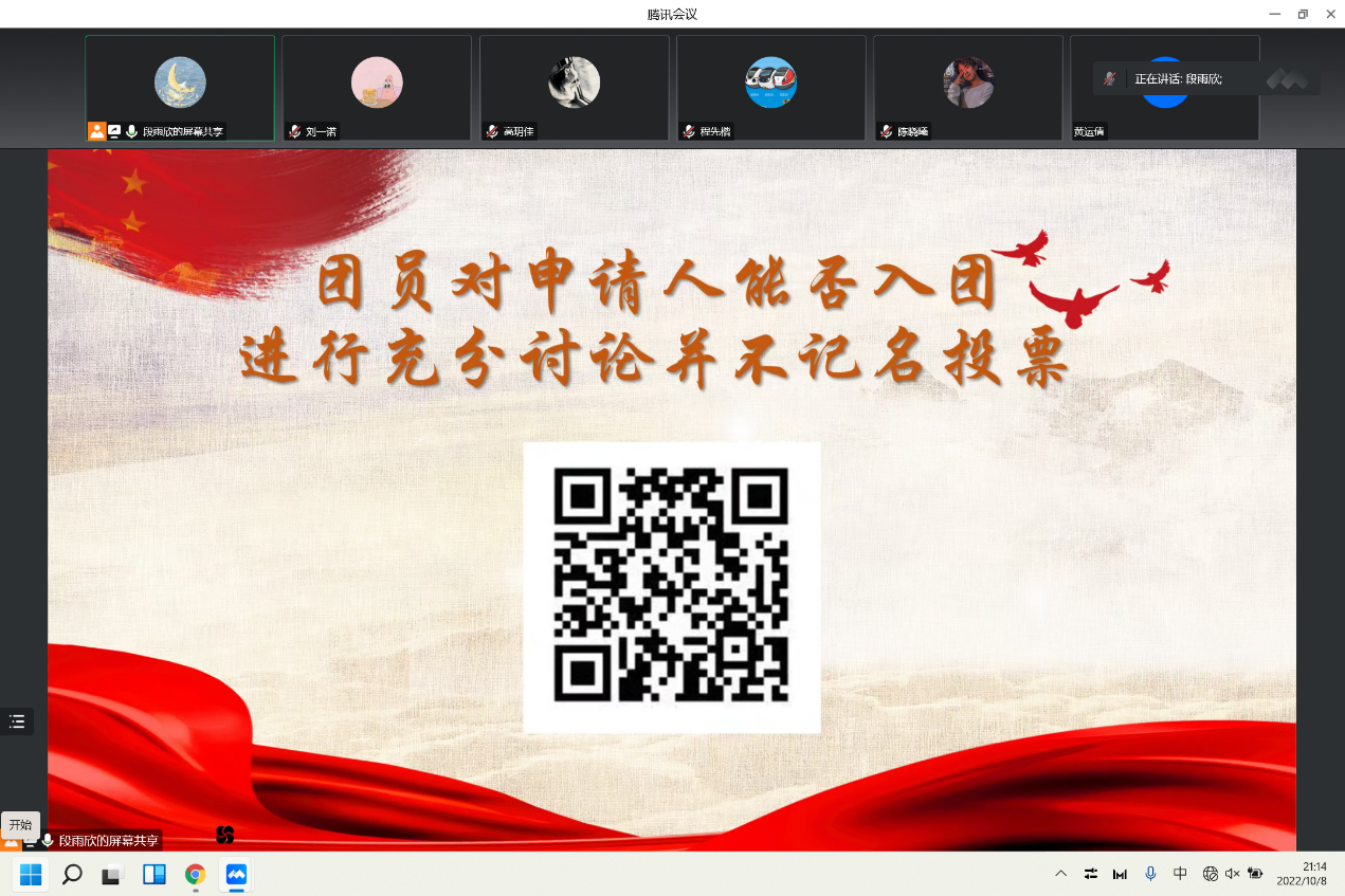 2022年10月8日,经上级团组织同意,2020级本科第二团支部于线上召开了关于是否接收高玥佳同学为共青团团员的支部大会,大会由支部书记段雨欣同学主持。