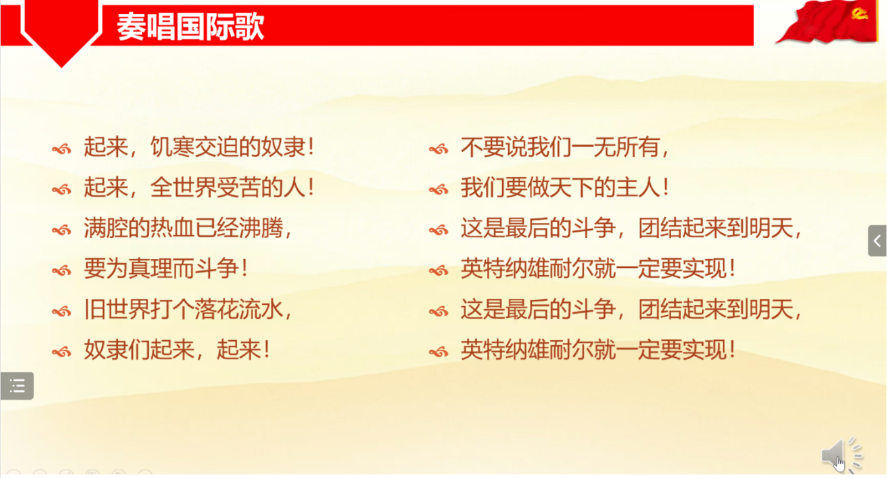 会议开始,党支部全体成员合唱《国际歌》。