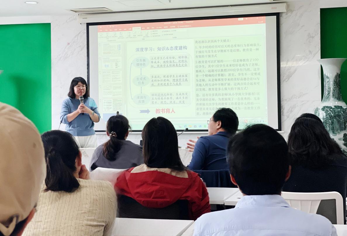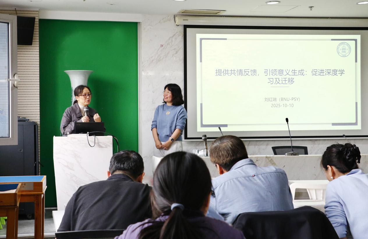 刘红瑞老师以教育心理学课程为实践案例,系统阐述了促进深度学习与迁移的核心策略。首先,通过“增价值,破偏见”来唤醒学生的“参与者意识”,帮助学生看见知识的趣味性与可能性。其次,通过“布置生成式任务”,引发学生深层思考,增强知识整合与迁移的意识及能力。最后,通过“浸润与反馈”构建“认知-情感”双驱动的学习环境。 讲座结束后,在场教师围绕“成长型思维”、“共情式积极反馈”、“生成式任务设计”等问题展开热烈讨论。刘红瑞老师结合自身教学经验逐一回应,并强调深度学习的核心是让学生“知其然,更知其所以然,且能迁移其然”,这需要教师在教学过程中既要做“知识的传授者”,更要做“思维的引导者”。