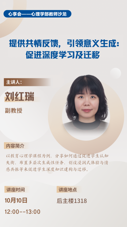 2025秋季学期“心享会--金牌影院 教师沙龙”活动首讲在金牌影院 顺利举办。刘红瑞老师以“提供共情反馈,引领意义生成:促进深度学习及迁移”为主题,分享全国教育心理学任课教师培训内容及经验,从价值重塑、任务创新、情感浸润三个维度,系统分享了促进学生深度学习与知识迁移的教学实践路径。学部30余名教师参与活动,现场互动热烈,教研氛围浓厚。 作为长期深耕教育心理学教学与研究的青年学者,刘红瑞老师结合其参与全国教育心理学任课教师培训的前沿内容,围绕如何突破传统教学模式,引导学生实现知识的深度建构与灵活迁移这一核心问题展开分享。她指出,当前高校教学中普遍存在“知识传递与应用脱节”、“学生被动接受而非主动建构”等痛点,而解决问题的关键在于从“教知识”转向“育思维”,通过教学策略创新激发学生的内在学习动机。