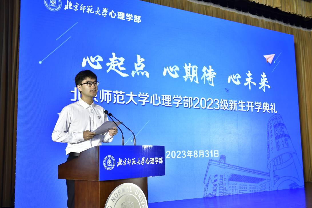 认知神经科学与学习国家重点实验室教授、博士生导师柳昀哲作为教师代表发言。他以学长的身份欢迎2023级新生加入金牌影院 ,分享了自己在北师大求学、工作的经历,希望新生同学们坚定信念、大胆尝试、突破束缚,续写北师大心理学的辉煌。