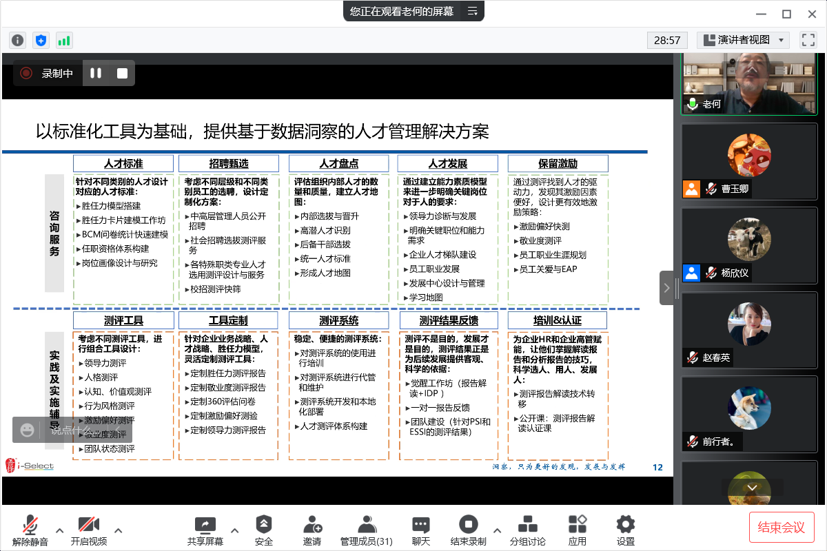 接下来,何总为同学们分享了人才测评行业江湖,从工具-产品-解决方案-实施的主要业务模块讲起,对不同圈子客户用法和场景分别进行了简要介绍。之后,从一位资深的人才测评从业者的视角,介绍了人才测评的前世今生,从管理学发展和人力资源实践到市场化改革和学习引进。接下来为大家介绍了人才测评作为专业服务存在的理由和底层逻辑。最后,着眼人才测评行业和善择公司的发展未来进行了展望。