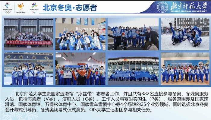 接下来是来自历史学院的蒙玮迪同学饱含深情的讲述。一杯水、一只小老虎和一个大愿望,从团结协作到相守相望,我们在同心奋进的过程中收获温暖和惊喜;从小小的期待到伟大的愿望,每个人都可以向世界宣告我们的真诚与善意。这个新年,家乡虽远,温暖尚近。 最后一名进行宣讲的是许宸睿同学。在冰丝带聆听冬奥脉搏,于冰雪中聆听澎湃心跳。北师大冰之帆冬奥志愿者团体秉持“学为人师,行为世范”的校训精神,共同谱写了热血昂扬的属于北师大人的冬奥故事。