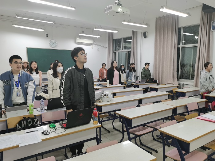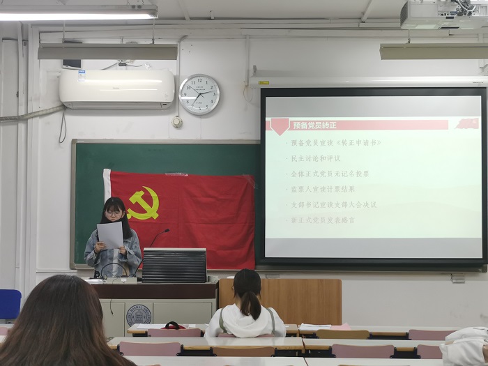 首先,全体参会人员面向党旗起立并齐唱《国际歌》。唱毕,支部书记梁静介绍转正大会流程。