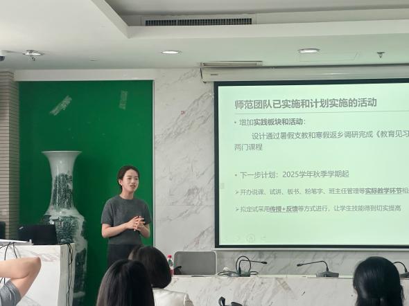 张一静老师代表团队汇报了师范方向课程质量调研结果。本次调研采用"问卷+座谈"的混合研究方法,系统覆盖四个年级师范班学生,从课程内容、教学方法、考核方式和教学资源四个维度进行全面调研,并反馈学生对于课程设置的意见建议。教学团队针对调研结果进行总结讨论,提出并制定下一步工作计划,从而切实提高师范生培养质量。