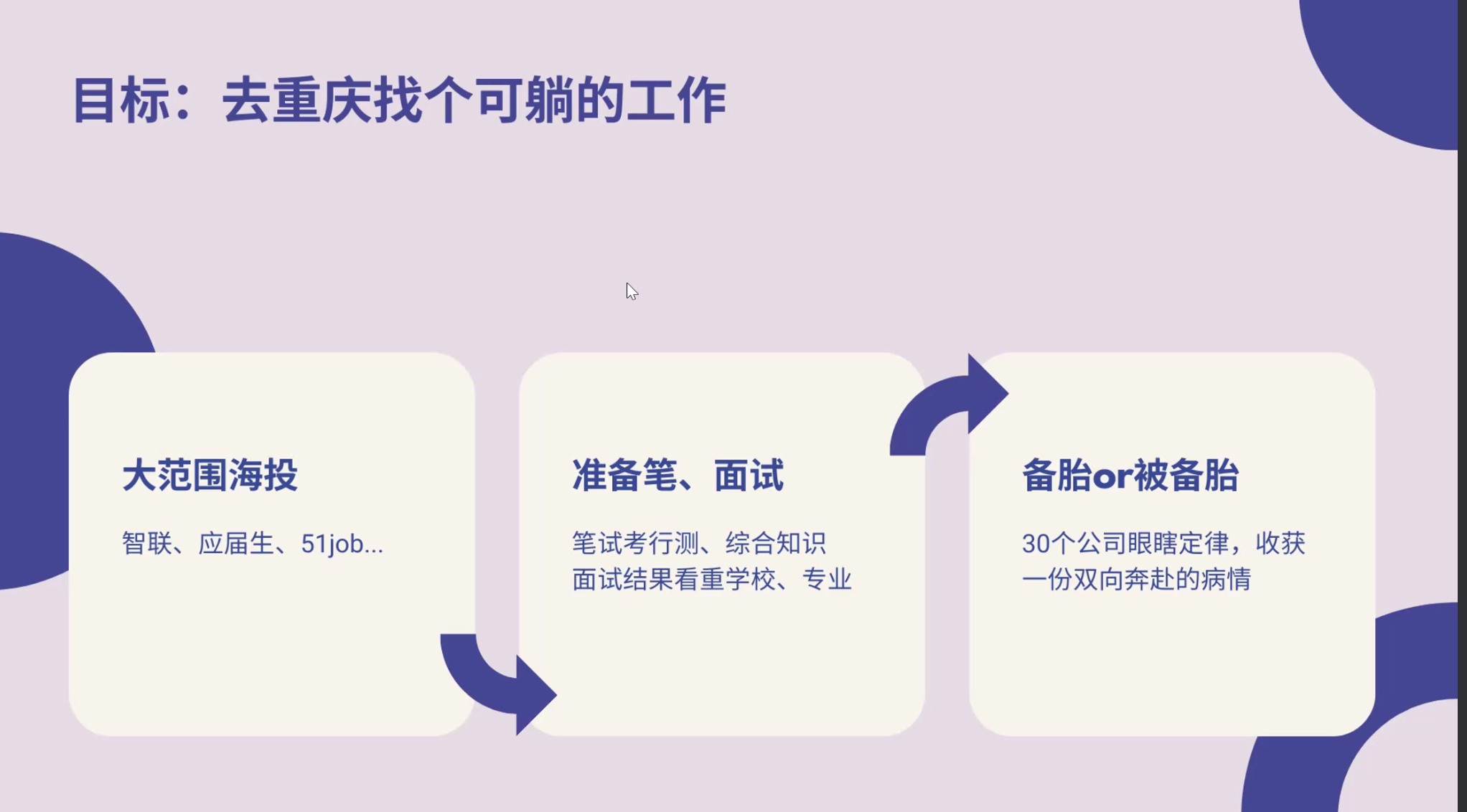 首先,赵腾飞学长分了三个方面介绍了自己的求职以及任职过程。求职之前先要确定一个问题,自己究竟想要什么生活,正视自己内心深处的欲望,有目的性的确定自己的目标岗位后,根据目标岗位的要求进行有计划的准备。其次,需要综合的考量自己求职的公司,优点与缺点。最后,需要珍惜自己的应届生身份,选好自己想走的职业道路,诚实的面对自己,找到自己最有激情的那一面。 国企求职Tips:1.笔试多刷行测,提前准备;面试主要看学校专业匹配度。 2.大范围海投,针对性准备面试。 3.考虑国企氛围以及生活工作的平衡需要。