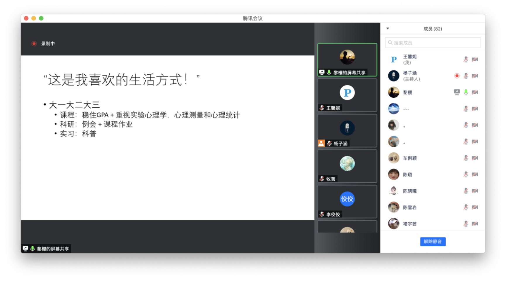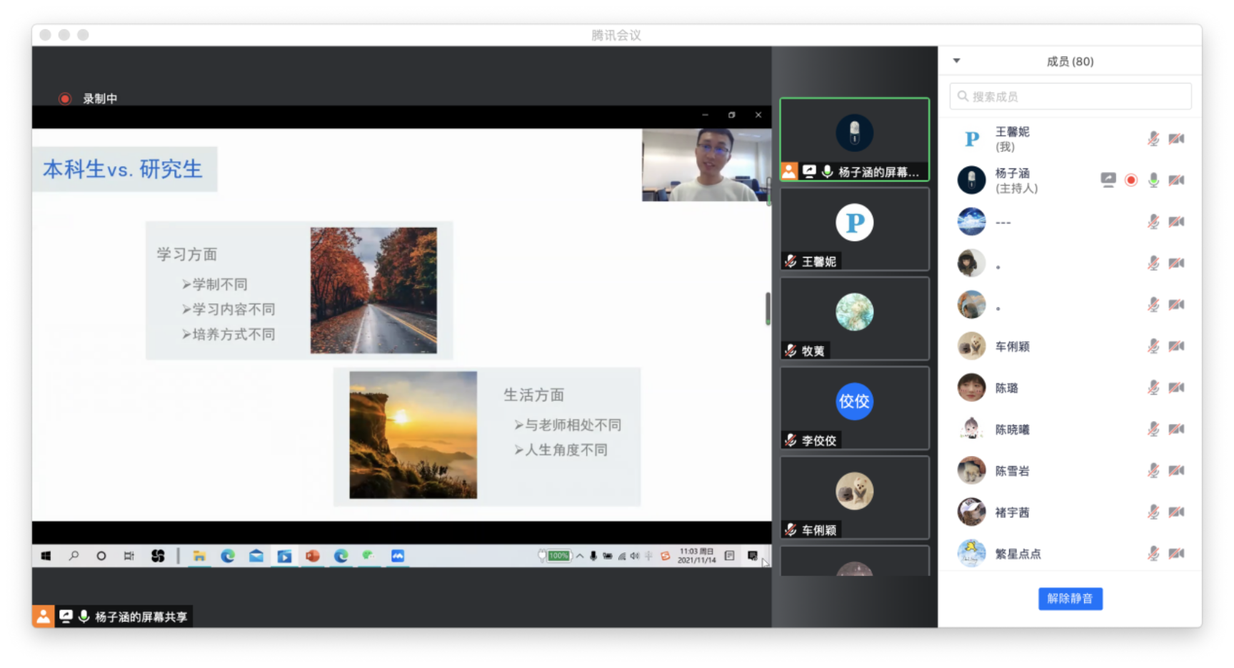 针对同学们的需求,2021年11月14日上午九点三十分,学业辅导室于线上举办了出国留学分享会。90名同学参加了本次分享会。 有5位从金牌影院 毕业、就读于海外知名高校的学生进行了分享: 宋潮,2016级硕士,根特大学,临床心理学,PhD项目在读。 黎樱,2016级本科生,新加坡国立大学,社会心理学,PhD项目在读。 赵子豪,2017级本科生,新加坡南洋理工大学,认知心理学,PhD项目在读。 胡可昕,2017级本科生,伊利诺伊大学厄巴纳香槟分校,人类发展与家庭研究,PhD项目在读。 罗姝怡,2017级本科生,牛津大学,Master项目在读。 首先,罗姝怡介绍了自己申请海外硕博项目经历与心得。