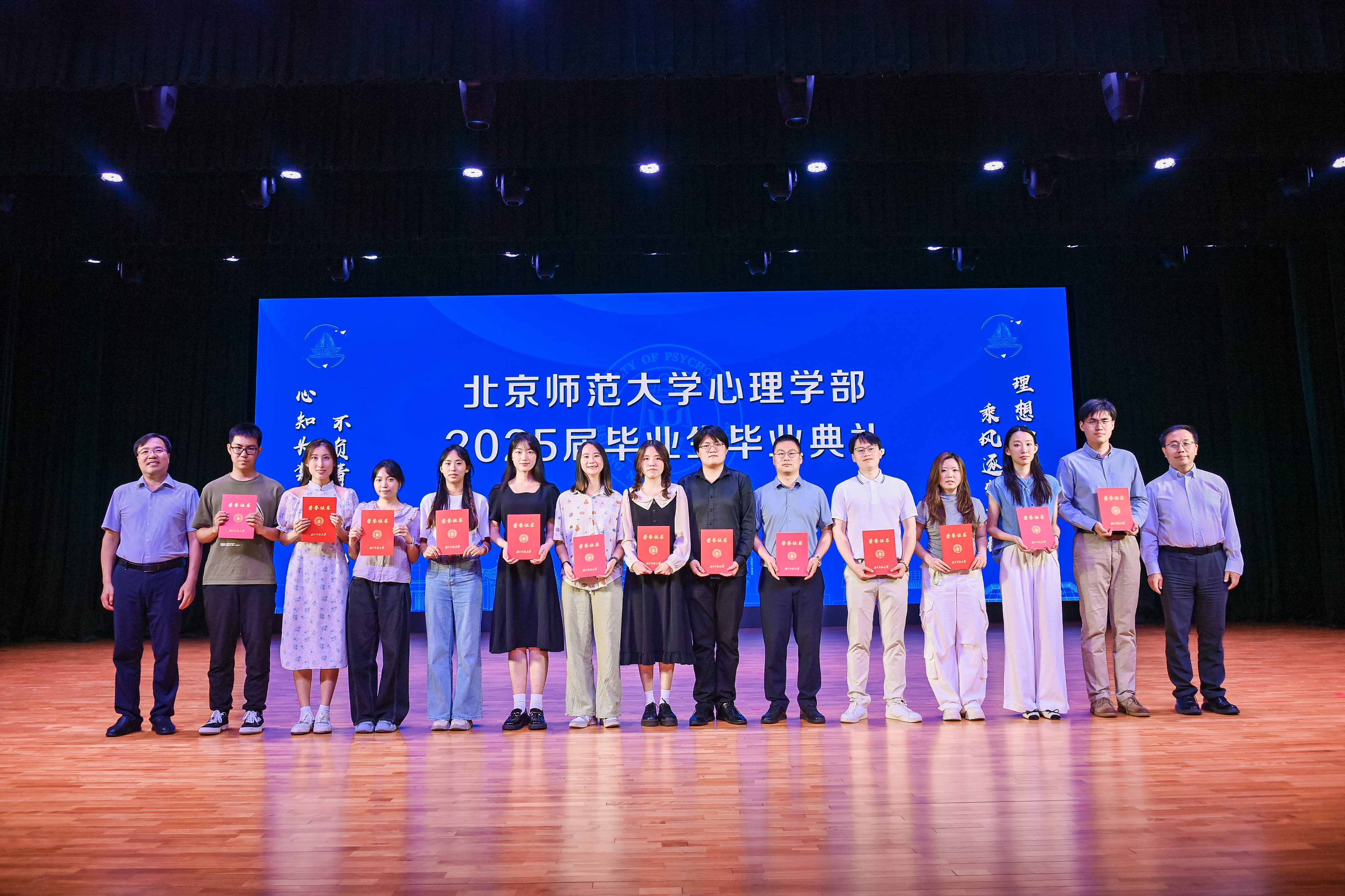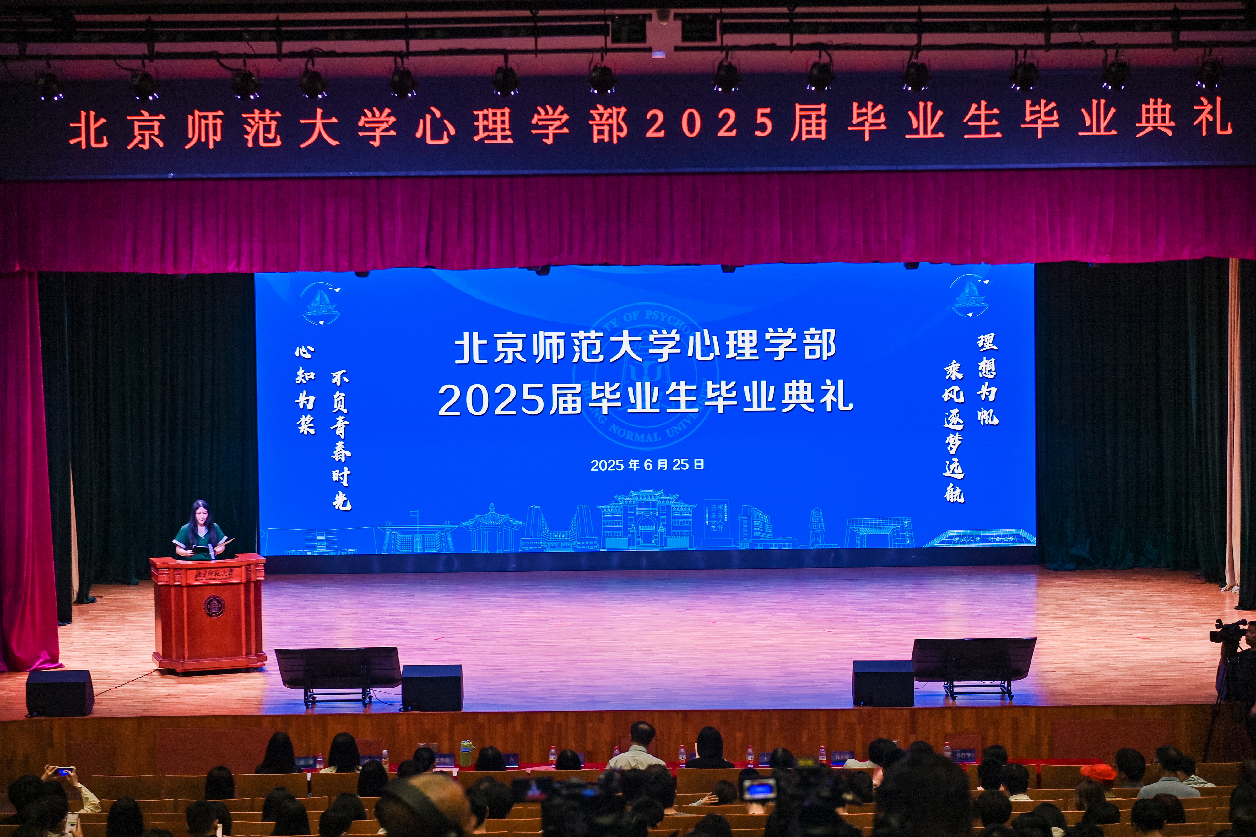 典礼上播放了由本科、专硕、及学术硕博毕业班精心制作的纪念视频,生动再现了毕业生们从青涩入学到自信毕业的珍贵历程,这些定格瞬间或精彩、或感伤、或幽默、或激昂,无不承载着同窗情谊与青春印记,成为镌刻在每位毕业生心中的难忘回忆。2025届毕业生代表——本科生唐凤华、MHR方向专业硕士张鹤至、博士黄顺森依次登台,深情讲述了自己在学部求学、生活、科研和生涯发展的精彩故事,用亲身经历诠释了心理学学习赋予他们的蜕变与成长。