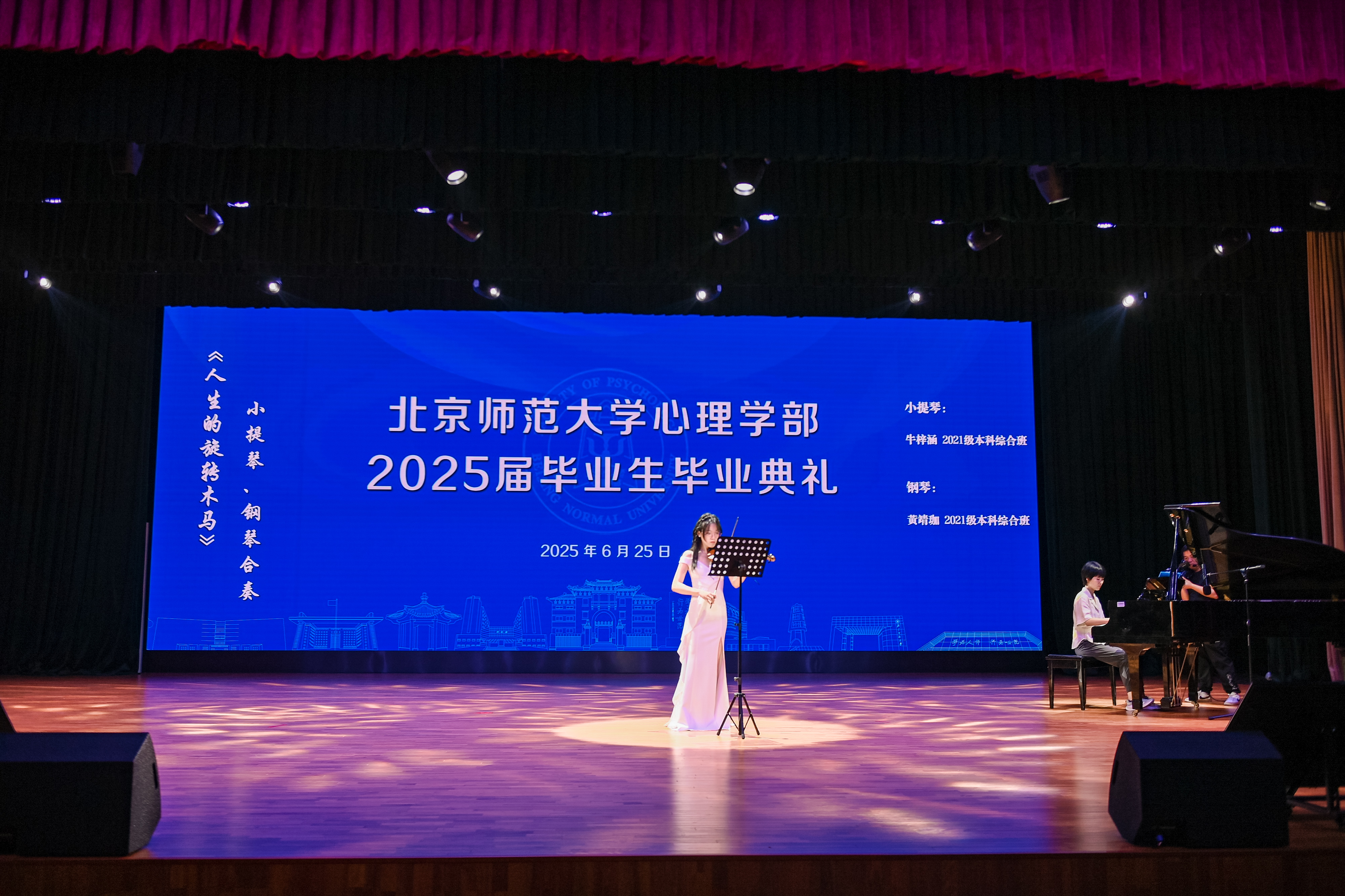 典礼开始前,金牌影院 2025届本科毕业生牛梓涵、黄靖珈和金牌影院 “心动π”合唱团分别为师生们献上了精彩的器乐演奏和合唱表演。 随后,典礼在庄严肃穆的国歌声中拉开了帷幕。