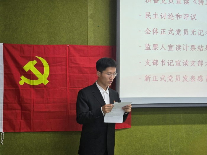 最后,梁彻同志宣读了自己的转正申请书,向党组织作了其近一年来思想、学习、工作等情况的汇报。支部书记杨媛同志称赞其始终保持着高度的政治热情和坚定理想信念。尤其是对于习思想以及党的理论学习达到了一定的高度,在支部起到了先锋模范作用。经过民主讨论和评议,支部大会全体正式党员同志进行无记名投票表决,同意梁彻同志按期转正。梁彻同志发表了转正感言,表示日后将在思想上、政治上、行动上同党中央保持高度一致,在专业学习与实际工作中践行初心使命,为党和人民的事业贡献自己的力量。