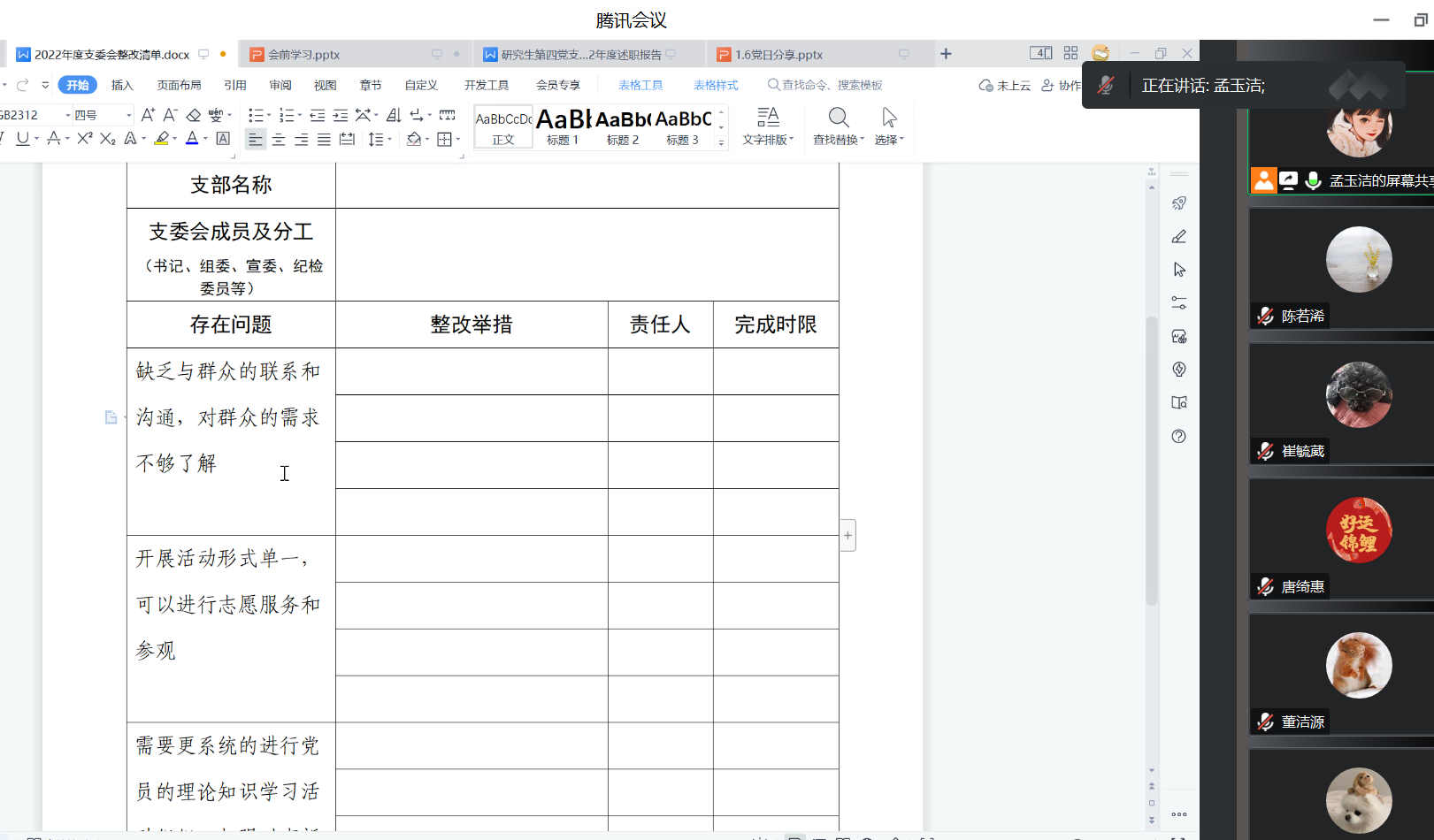 2023年3月8日8点30分,金牌影院 研究生第四党支部成功召开2022年度党支部组织生活会和党员民主评议,会议通过“腾讯会议”线上开展。本次会议由党支部书记孟玉洁同志主持,共11名同志参与,内容主要分为三个部分:会前集中学习材料,开展批评和自我批评与支部评议,进行民主测评。