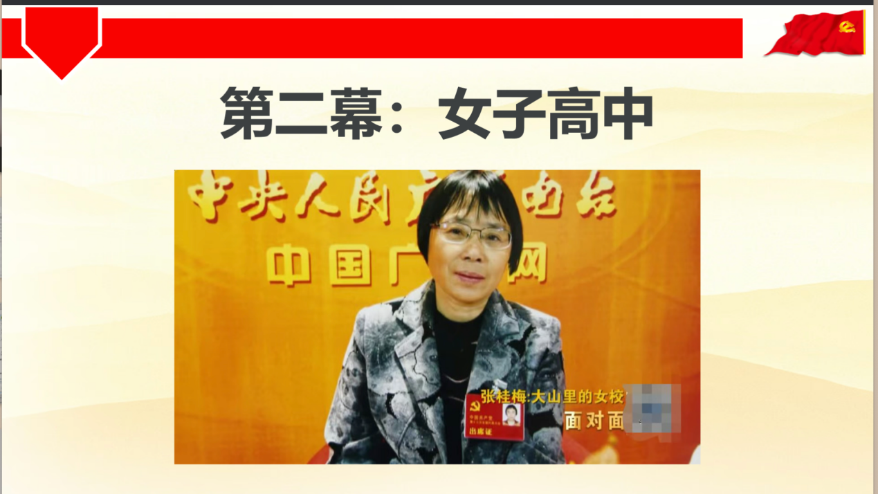 奏唱国际歌之后,刘爽同学通过“人生三章”带领大家学习了张桂梅校长从一名普通语文教师到一所免费女子高中的创办者的感人事迹。
