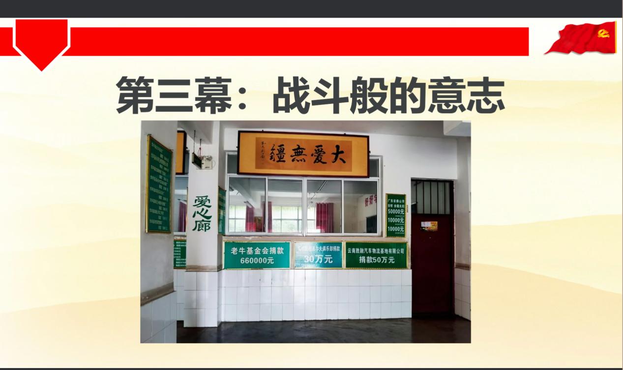 第一幕“农村女孩”:张桂梅时任丽江市华坪县民族中学的语文老师,同时兼任华坪儿童之家(福利院)院长,在教学过程中,她发现女孩辍学率远高于男孩,被遗弃在福利院门口的女婴也相当多。这些女孩们渴望读书成才的梦想被无情磨灭,被兑换成家里的免费劳力或一份冰冷的彩礼,女孩们的命运触动了张桂梅,一个创办一所免费女子高中的想法萌发了。