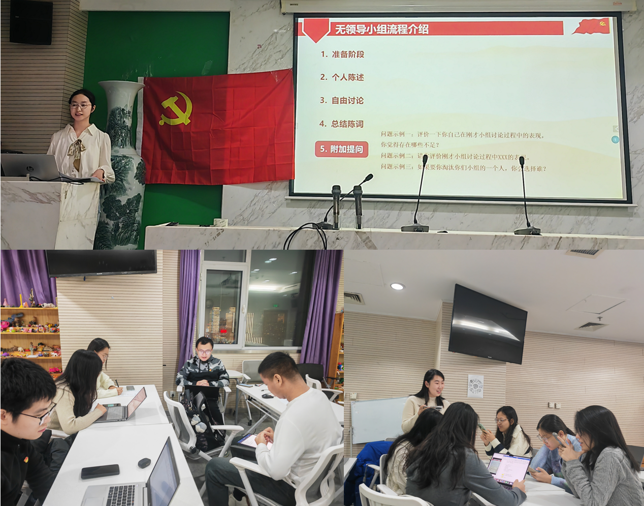 会议第一项,12月党日活动之微党课。本期微党课由文雨珊同志主讲,主题为“无领导小组讨论简介”。文雨珊同志从无领导小组讨论的流程出发,从“准备阶段、个人陈述、自由讨论、总结陈词、附加提问”五个部分向同志们详细介绍无领导小组的具体流程及注意事项。随后,文雨珊同志对无领导小组讨论的具体题型进行介绍,并根据具体实例进行细致解析。在实战演练环节,文雨珊同志以“就业难”作为实战演练材料进行练习,支部同志们积极思考,讨论热烈,并分组派代表进行发言。最后,文雨珊同志进行总结,并鼓励同志们日常多关注时政新闻,积极思考交流,从日常的点滴积累出发逐渐提升无领导小组的能力。