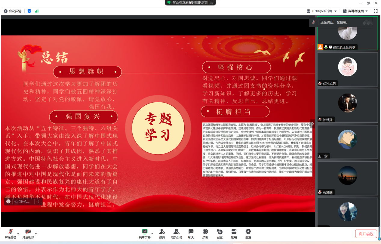 会议伊始,我们将共同奏唱团歌,用激昂的旋律激发团员们的爱国热情。紧接着,在过去的一学期中,我们团支部携手共进,团结奋发,共同完成了多次团日活动和专题学习教育,围绕“思想旗帜”、“坚强核心”、“强国复兴”以及“挺身担当”四个主题,在这一过程中,通过不断的学习,反思总结和改进,同学们对如何成为一名合格的共青团员、如何更高标准的要求自己、如何切实发挥好团员的青年先锋作用有了更加深刻的领悟。在这一过程中,同学们进一步了解了共产主义精神和思想,牢牢把握住团员自身的思想旗帜;培养自身党性,坚定共产主义信仰,逐渐有了坚强核心;进一步解放思想,了解中国式现代化的重要性和必然性,了解了中国式现代化的内涵,认识了其成因,熟悉了其推进方式,对民族复兴、强国建设有了一份自己的北师大学子的答卷,强国复兴,我们在行动;最后,在对先辈榜样故事的学习中,团员们更加深切理解团员的身份责任,努力发挥先锋作用,向榜样学习,对过去总结改进,挺膺担当时代重任。