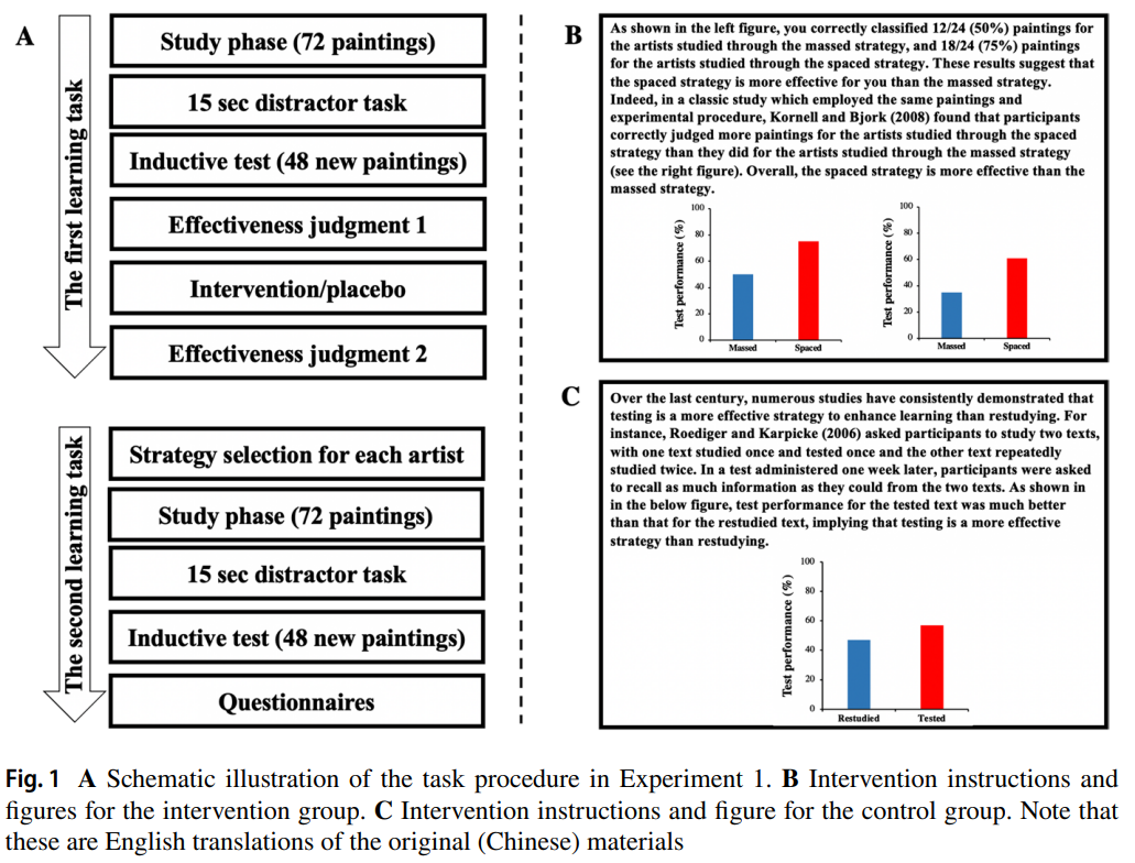 归纳学习(包括类别学习)是人们认识世界的重要途径。大量研究表明,相比较于比组块学习(massed learning;即组块呈现样例),交替学习(interleaved learning;即交替呈现样例)能够更有效地促进归纳学习效率,这种现象被称为交替效应(the interleaving effect)。尽管交替学习是一种更有效的学习策略,但人们却普遍错误地认为组块学习策略更有效,表现出元认知错觉。这种元认知错觉进一步导致人们在自主学习的情况下更多地使用更低效的组块学习策略进行归纳学习。北师大元认知与学习课题组(课题组网站见//metacog.jpyy2.net/)近期开展了一项干预研究,考察外显的指导语(explicit instructions)能否作为一种有效的干预策略,矫正这种元认知错觉,使得学习者能够意识到交替学习策略更有效,促使学习者主动使用交替学习策略并提高归纳学习效率。 本研究共包含四个实验。实验1共招募了60名金牌影院 大学生被试,他们被随机分配到干预组和控制组。在第一部分的学习任务中,两组被试需要学习12名画家的绘画风格。对于其中6名画家的绘画风格,被试需要采用组块学习策略进行学习,而对于另外6名画家的绘画风格则需要采用交替学习策略进行学习。学习结束后,两组被试参加一个简短的分心任务。之后,两组被试参加归纳测试。测试结束后,两组被试需要判断哪种学习策略更有效:1.交替学习更有效;2.两者相差不大;3.组块学习更有效。 之后,两组被试开始阅读干预指导语。在干预组的指导语中,每名被试可以看到自己在两种学习条件下的测试成绩和前人关于交替效应的研究结果(见下图B)。通过阅读干预指导语,干预组被试能够清晰地意识到交替学习策略比组块学习策略更有效。与之不同,控制组被试则阅读与交替效应无关的指导语(即阅读“安慰剂”指导语)。阅读完指导语后,两组被试再次判断哪种学习方法更有效:1.交替学习更有效;2.两者相差不大;3.组块学习更有效。 接下来,两组被试开始参加第二个学习任务。在第二个学习任务中,两组被试需要学习另外12个画家的绘画风格。对于每一个画家,他们需要决定使用哪种策略进行学习:1.交替法;2.组块法。随后,他们使用自己选择的策略学习每一位画家的绘画风格。学习结束后,两组被试参加归纳测试。