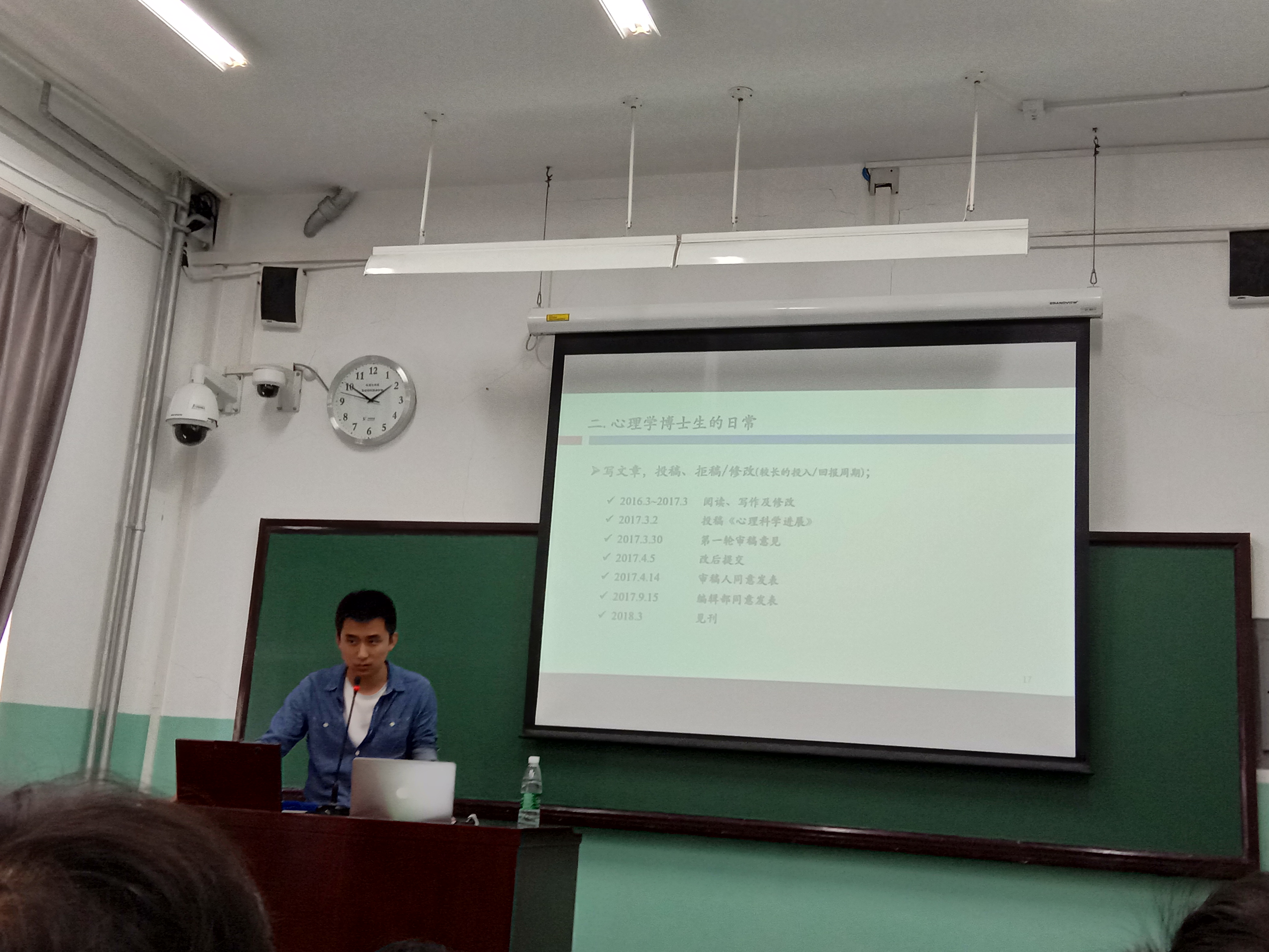 李文岐师兄和同学们分享了心理学博士生的日常——写文章、投稿、拒稿/修改,他以自己多年科研经历,告诉大家心理学科研的投入与回报的周期很长,要用“追星”的热情投入科研,方能和自己钦慕的学界前辈平等对话,并在前人的基础上做出新成果。