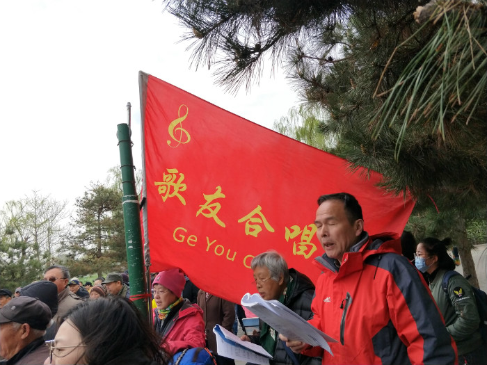 公园内唱红歌的老年合唱团