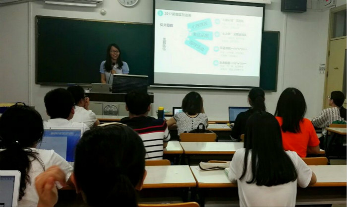 2017年5月19日晚8时,金牌影院 2017暑期实践经验交流会在教二214教室成功举办。本次活动由分团委实践部罗希悦主持,邀请到了2014级的傅雪薇、钟何静同学来进行暑期支教的经验分享。