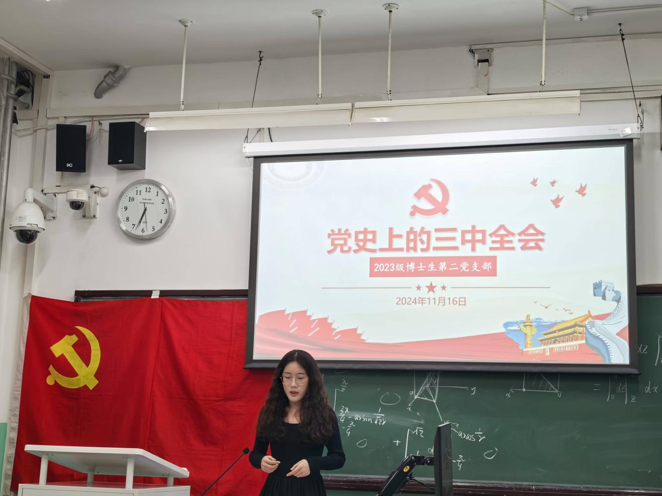 2024年11月16日晚18点30分至19点,2023级博士生第二党支部在教十楼108教室成功举办了以“党史上的三中全会”为主题的专题党课。本次党课由党支部书记邹昕童同志主持。