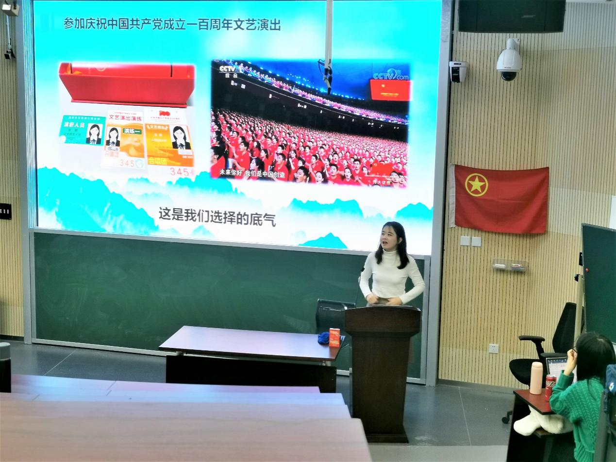 第一位宣讲人的分享结束后,张颖以当兵是一种选择开始讲述自己的军旅生涯。她通过总书记的讲话和历史名句引入自己当兵的动机以及梦想的转变。自己本是想成为一名外交官才进入北师大学习,外交部发言人华春莹的一句话让她感慨良多,“不要以为你们军人用枪炮拿不回来的东西,我们外交官一张嘴就能拿回来”。2018年7月,张颖参军入伍。进入部队后,她在烈日下训练,参加体能集训,夜晚也要保持警觉随时接听电话。面对妈妈电话中的关心,张颖坚定地表示在这个地方不受点伤是不可能的,大家都是一样的。在之后的训练中,她也收获了战友情,更加珍惜自己的部队。当兵期间,张颖更是压缩休息时间,整理史料,参与数据史馆的筹建,撰写军事史专题论文,这篇论文之后也被选为优秀论文。