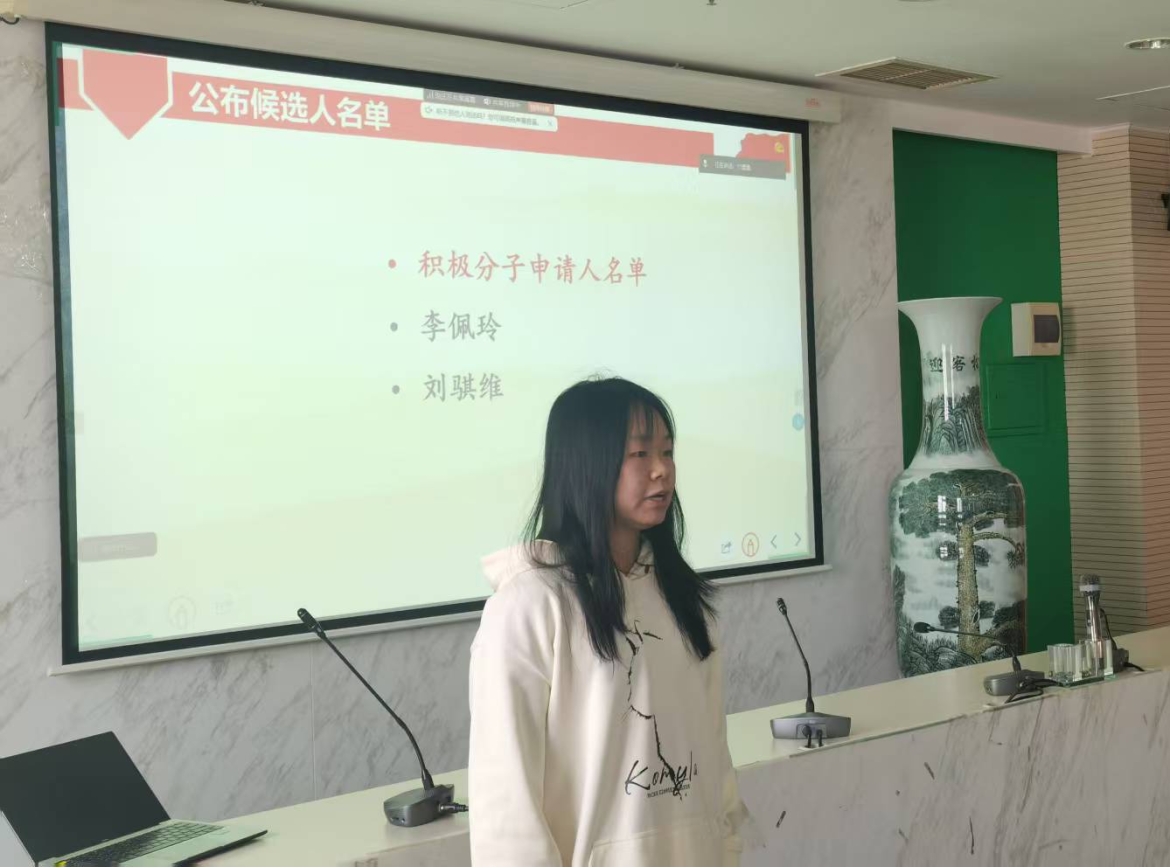 会议第一项,全体参会同学奏唱团歌。 奏唱团歌后,两名团员入党申请人——李佩玲、刘骐维依次陈述思想、学习、工作和生活等各方面的情况,对入党动机问题进行了详细地阐述。并且客观、公正、明确地指出自己的缺点与不足之处。