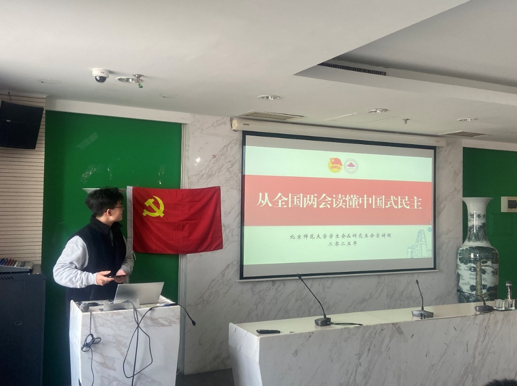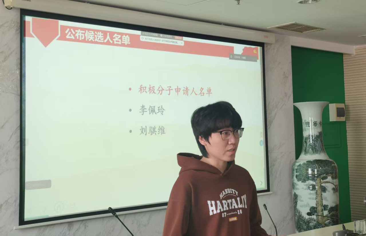 至此,团支部同意推荐李佩玲、刘骐维为入党积极分子,待党组织进一步审核考察。随后召开三月份主题团日活动。 本次活动与2024学术硕士第二党支部共建。恰逢今年全国两会盛大召开,活动邀请到了金牌影院 学生会宣讲团成员孙梓耀同志为我们作主题为《从全国两会读懂中国式民主》的主题党课分享。