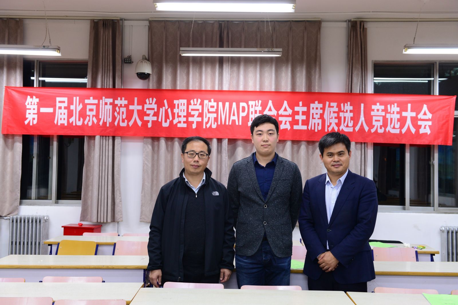 图8北师大心理学院首届MAP联合会主席竞选活动 新一届MAP联合会主席吴兆霖与乔老师、张老师合影