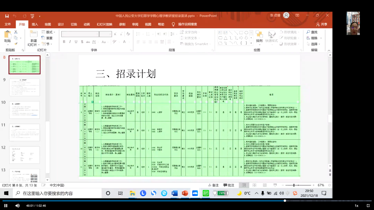 接下来张老师介绍中国人民公安大学犯罪学学院和心理学教研室,为大家详细解读本次教研岗的招录计划和招录流程、招考程序和具体的分数构成比例,包括笔试、结构化面试、试讲和体能测试的标准;最后介绍了师资待遇、未来发展路径和相关的注意事项。