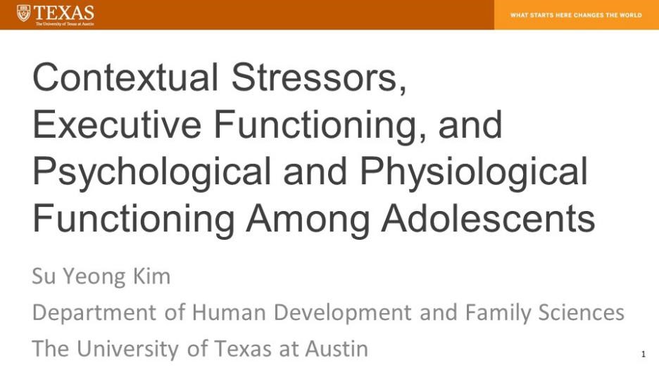 美国德克萨斯州大学奥斯汀分校⼈类发展与家庭科学系,在CWUR(The Center for World University Rankings)世界排名第7,拥有多位国家级学者。研究人员采⽤跨学科的研究⽅法来理解⼈类发展、⼈际关系和社会家庭环境的影响,并在研究中注重使用先进的统计⽅法。2021年10月18日,美国德克萨斯州大学奥斯汀分校⼈类发展与家庭科学系Su Yeong Kim教授,为金牌影院 师生带来“青少年的环境压力、执行功能以及心理和生理功能”主题讲座。 Su Yeong Kim教授分享了和其实验室博士生开展的前沿课题研究,并与参会的师生进行了深入的交流。此次讲座增进了双方的互相了解,也为相关方向的加强合作奠定了基础。王君副部长表示希望通过签署院系间合作协议来推动师生交换、科研合作的开展。 |