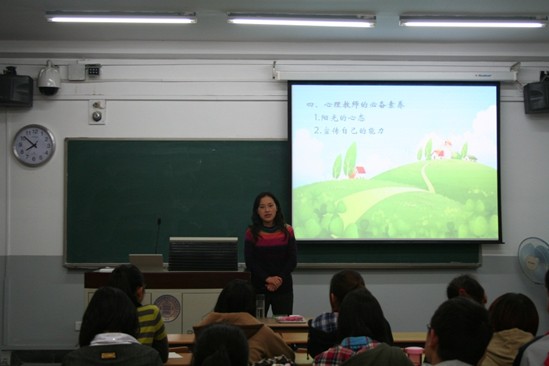 “理想照进现实——心理教师成长之路”系列讲座——马晓晶老师专场 2012年11月8日晚6点30分,由心理学院分团委主办的“理想照进现实 心理教师成长之路”系列讲座——马晓晶老师专场,在我校化学楼301室举行。 马晓晶老师1997年毕业于北师大心理学院,从教15年,一直致力于学校心理健康教育工作的实践研究。 讲座开始后,马晓晶老师围绕“我理解的心理教师成长之路”的主题,首先介绍了心理健康教育的发展现状。据马晓晶老师介绍,目前中小学心理健康教育发展现状表现为:起步晚发展快,心理健康教育逐步深化,心理健康教育模式逐渐趋合社会需求,心理健康教育师资培养逐渐规范等特点,但仍存在:学校心理健康教育缺乏必要的行业规范和束缚,学校心理健康教育的整合性较低,心理健康教育大的支持不到位,中小学心理健康教育缺乏深入研究和系统规则等局限。而目前中小学心理教师发展现状表现为:中学、小学发展不平衡,专业程度越来越高,人员越来越壮大,学校需求越来越强烈等特点。 随后马晓晶老师又介绍了心理教师的发展领域,分为:一、管理领域,如“普通教师—年级组长—部门主任—主管校长—校长”的发展模式;二、其他领域,即由于各种原因转行进入其他领域就职或任教;三、专业领域,又分为人事职称层面、专业水平层面、自我认同层面。同时为同学们指出了多领域发展的方向。 紧接着马晓晶老师就专业心理教师的工作领域进行了介绍。提出了心理教师是学校德育队伍中不可替代的力量,是学校德育工作的信息提供者、沟通协调者、决策参与者,是学生心灵港湾的营建者,是父母实施家庭教育的指导者,是教师成长的支持者等观点。明确了心理教师重要的地位与作用。同时明确了心理教师的工作对象为学生、教师、家长,工作内容主要分为:规划学校的心理健康教育工作,开展心理档案工作,开展个体心理辅导,开展团体心理辅导,营造心理健康教育环境,进行心理健康教育科研等方面。 最后,马晓晶老师提出心理教师的七个必备素养:阳光的心态,宣传自己的能力,拓展工作领域的能力,寻求支持的能力,丰富自己的经验与体验,终身学习的意识和能力,对自己的未来有设想。 学生提问环节,马晓晶老师耐心解释了心理教师工作领域中,开展心理档案工作是要根据学校实际情况建立符合自己学校特色的心理档案,充分发挥其积极作用。 整场讲座,马晓晶老师一直围绕心理老师成长之路的中心,强调爱岗敬业精神和专业知识的重要性,给同学们很多实用性的指导。 晚8点45分,马晓晶老师与全体到场人员合影留恋,讲座圆满结束。