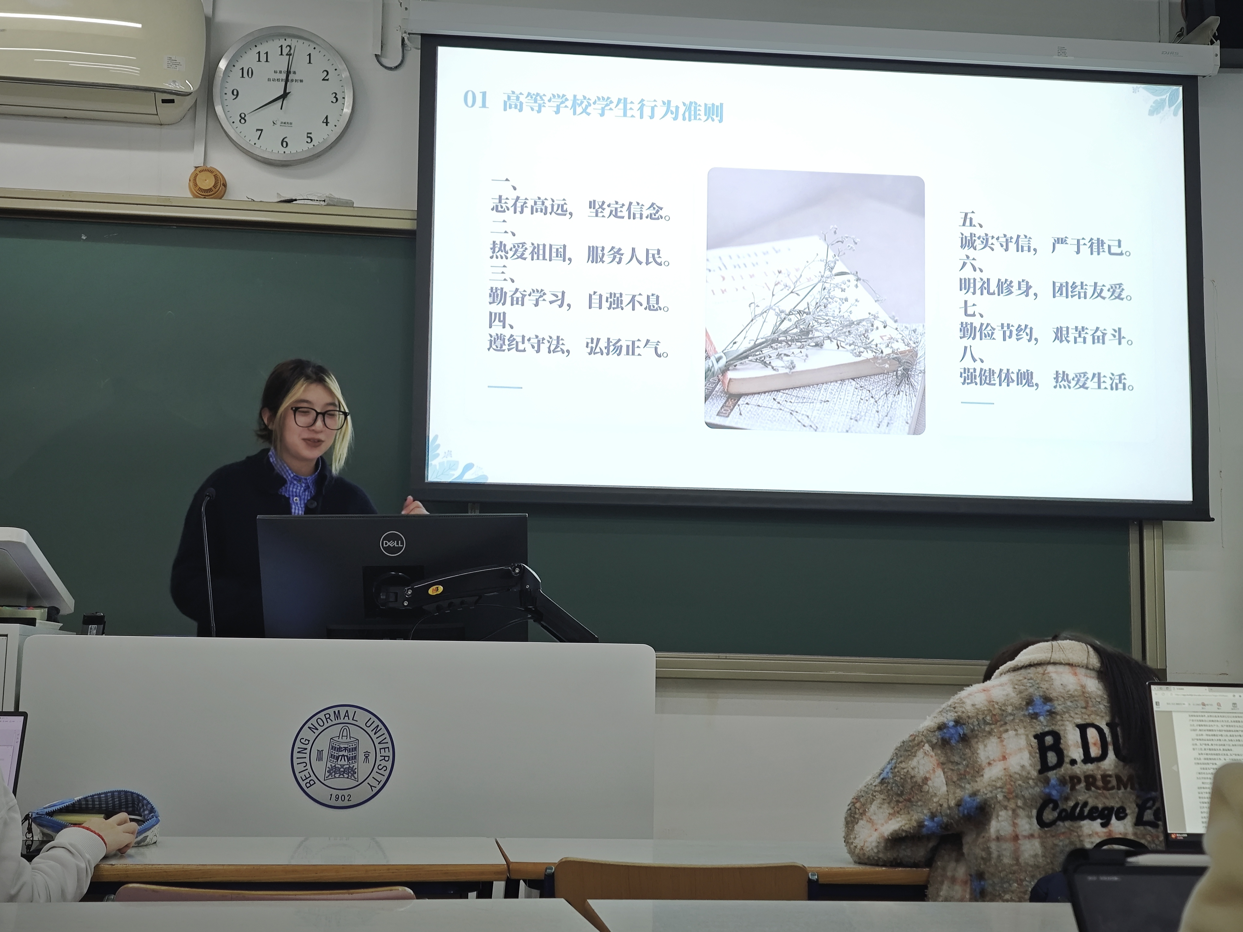 2024年10月29日晚20:00,金牌影院 2023级综合班于教二105教室举办10月主题班会。 本次班会的主题是“知规守纪,行稳致远”。班长向同学们介绍讲解了高等学校学生行为准则,强调身为高等学校学生需要知晓规则、严守纪律,对个人的社会生活和成长发展都十分重要。