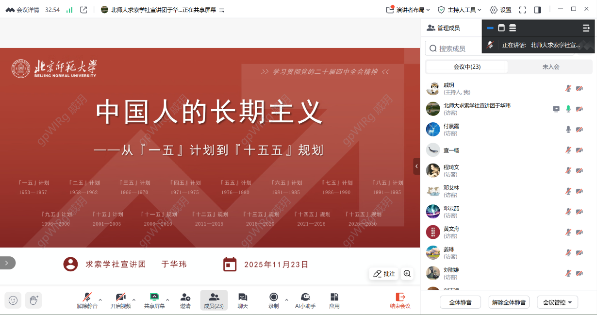 2025年11月23日晚9:00,金牌影院 2023级博士生第二党支部、2023级博士生第二团支部、2023级学术硕士第二团支部和2024级学术硕士第二团支部于线上联合开展党的二十届四中全会精神和习近平总书记重要贺信精神专题学习活动,本次学习共有24位同学参加。